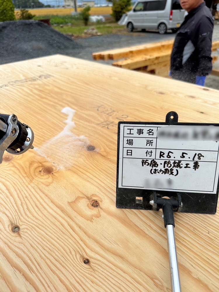 今回は、床下に入らない構造の為、棟上げ前に木材への散布をしております。